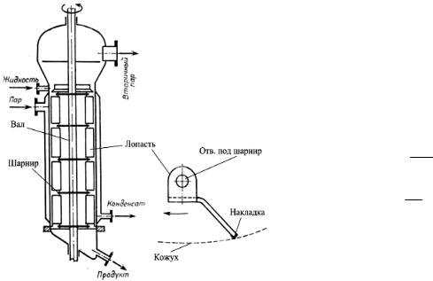 В последние годы получили распространение роторные пленочные испарители, в которых отсутствуют трубы, а пленка жидкости, стекающая по внутренней поверхности кожуха, подвергается механическому перемешиванию. Перемешивание пленки существенно интенсифициует как процесс теплообмена между жидкостью в пленке и стенкой аппарата, так и массообмена между жидкостью и газом. К достоинствам этих аппаратов можно также отнести повышение устойчивости пленки за счет создаваемой ротором центробежной силы и незначительное время пребывания жидкости в аппарате (важно для термолабильных веществ).