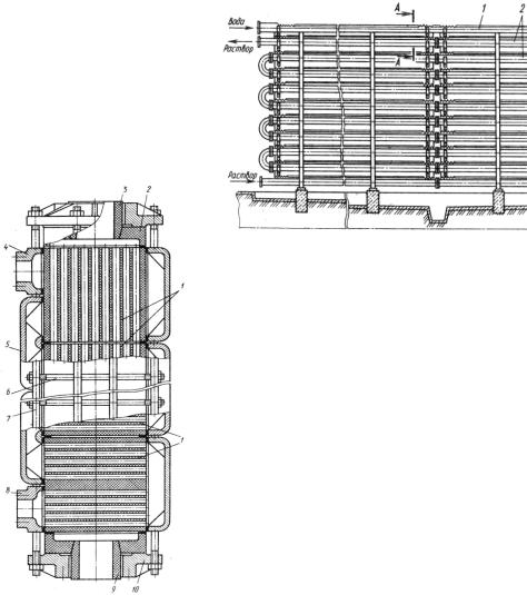 вые оросители. Расход воды в этих аппаратах меньше, чем в теплообменниках других типов, т.к. тепло от жидкости в трубах отводится не только за счет нагрева орошающей воды, но и частичного ее испарения. Оросительные теплообменники малоэффективны, но просты в изготовлении и ремонте. Чаще всего они устанавливаются вне зданий и используются для охлаждения агрессивных сред (серной кислоты).