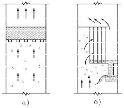 В аппаратах химической технологии чаще всего применяют отбойники ударного типа. Обычно это горизонтальные отбойники из сеток, см. рисунок 4.5а. Нередко применяются и отбойники из вертикально установленных уголков (рисунок 4.5б). Во всех конструкциях жидкость из потока газа выделяется в результате соприкосновения капель с поверхностью элементов отбойника и образует на их поверхности ламинарную пленку, а отвод жидкости осуществляется по разному: от горизонтального отбойника капли жидкости отрываются и движутся навстречу потоку пара, а в отбойниках из вертикальных элементов она стекает на специальный лоток и через гидрозатвор возвращается в процесс.