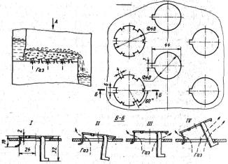 Однощелевой сливной карман (рисунок 4.13а), состоит из патрубка и отбойного диска, укрепленного так, что между ними образуется кольцевая щель шириной 4-12 мм. Через эту щель вытекает кольцевая струя жидкости, образуя дополнительную зону контакта.