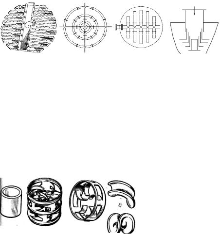 Для повышения эффективности массообмена кольцевую насадку делают перфорированной и с внутренними перегородками. В Германии предложена кольцевая насадка размером 50x50 мм из коррозионно-стойкой стали – так называемые кольца Палля (рисунок 4.16б). На цилиндрической поверхности насадки выштампованы и отогнуты вовнутрь лепестки шириной 10 мм. Механическую прочность насадки обеспечивают кольцевые гофры.