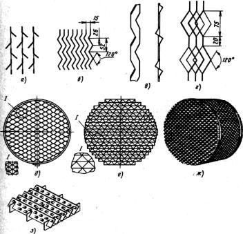 насадки привариваются точечной сваркой. Разновидностью гофрированной насадки является Z-образная насадка, которую изготавливают из перфорированного листа (рисунок 4.17г). По основным технологическим параметрам эта насадка на 1520 % превосходит плоскопараллельную.