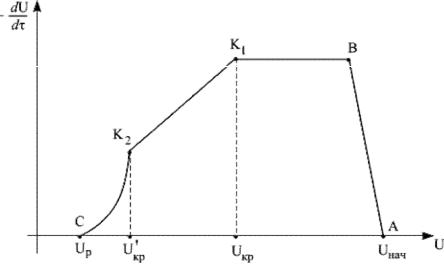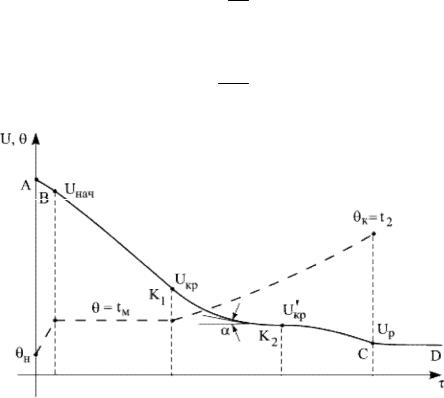 го Uнач до критического Uкр. Температура материала θ в течение всего первого периода соответствует температуре мокрого термометра tм сушильного агента. Во втором периоде (К1С) температура материала повышается до конечной температуры сушильного агента t2, а влагосодержание падает до равновесного Uр и далее не меняется (CD). Если второй период состоит из двух стадий, то выделяется участок равномерно падающей скорости сушки (К1К2) и отмечается второе критическое влагосодержание U'кр. Путем графического дифференцирования кривой сушки, т.е. проведения касательной к ней и определения тангенса угла ее наклона к оси τ (угол α на рисунке 5.1), можно вычислить мгновенную скорость сушки и на основе результатов дифференцирования построить кривую скорости сушки (рисунок 5.2). С