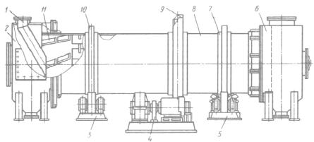 1 – загрузочный лоток; 2,6 – загрузочная и разгрузочная камеры; 3 – опорная рама; 4 – привод; 5 – опорно-упорная станция; 7 – кольцевая накладка; 8 – обечайка барабана; 9 – зубчатый венец; 10 – бандаж; 11 – приемно-винтовая насадка