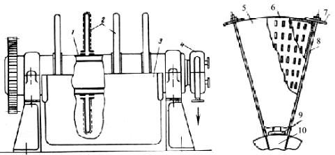 нее. Они имеют поверхность фильтрования от 1 до 100 м2. Барабан диаметром 1÷4.2 м и длиной 0.35÷7.5 м совершает от 0.1 до 3 об/мин.