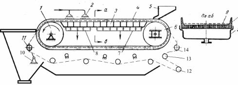 9 – фильтровальная ткань, 10 – нож, 11,12,13,14 – разгрузочный, винтовой, натяжной и