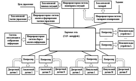 Структурная схема информационноуправляющей системы, построенной с использованием автономных модулей, приведена на рисунке 1.3.4. Все модули объединены в бортовую двухпроводную или однопроводную сеть. Дублирование линий связи позволяет повысить надежность такой системы»[2].