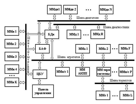 На рисунке 1.2.2 применены следующие обозначения: ЦБУ - центральный блок управления, БАФ - блок (библиотека) автомобильных функций; Бди - ММи - мехатронные модули измерительной/диагностирующей системы; ММдв - мехатронные модули двигателя; ММдR - мехатронные модули системы диагностики; ММаN, F - модули агрегатов автомобиля; ММ п/с Р - модули подсистем автомобиля; ММтI, L - мехатронные модули тормозной системы; ММ тормсист - головной ММ тормозной системы; ММ АКПП - модуль автоматической коробки переключения передач.