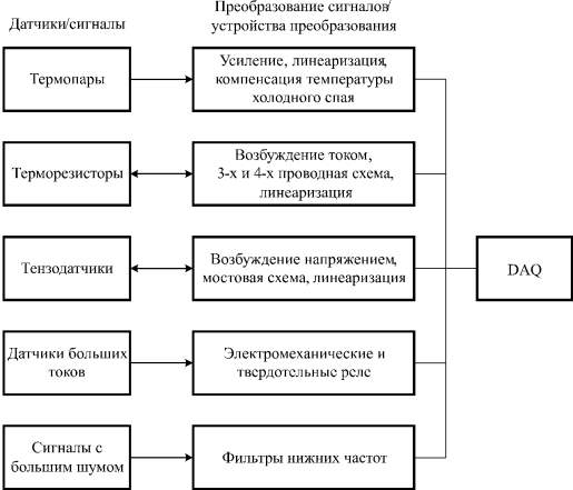 Прежде чем компьютерная измерительная система сможет измерить некоторую физическую величину, например, температуру, физический сигнал с помощью датчика или измерительного преобразователя должен быть преобразован в электрический ток или напряжение. Под преобразованием сигналов следует понимать процесс предварительной обработки сигналов с целью улучшения точности измерений, качества изоляции цепей (развязки), фильтрации и т.д.