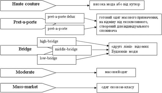 Специфіка функціонування сучасної індустрії моди така зумовлює диференціацію брен- дів, які займають сегменти різних класів одягу. Згідно з цією класифікацією весь спектр модного одягу поділяють на п’ять основних класів: haute couture, pret-a-porte, bridge, moderate і mass- market (рис. 2).