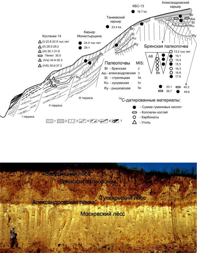 1 – брянская почва; 2 – поздневалдайский лёсс; 3 – позднеплейстоценовые склоновые отложения (педоседименты, делювий, солифлюкций и т.д.); 4 – аллювий; 5 – эмбриональные (пионерные) почвы; 6 – голоценовый чернозем; 7 – пойменные почвы и отложения.