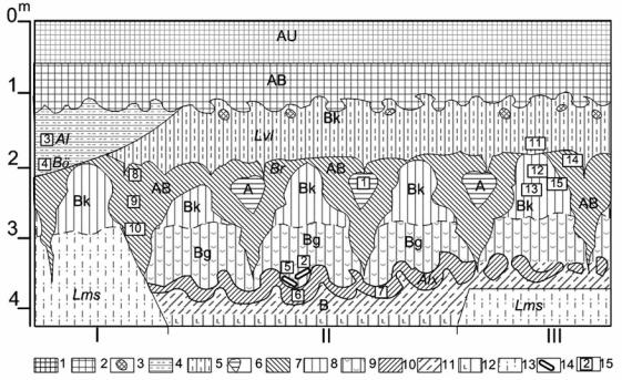 I – на плакоре (вне палеобалки), II – над московско-микулинской палеобалкой, III – на склоне палеобалки. Горизонты современного чернозема: 1 – AU, 2 – AB; 3 – кротовины; 4 – заполнение поздневалдайского делля; 5 – поздневалдайский лёсс; горизонты брянской почвы: 6 – A, 7 – AB, 8 – Bg, 9 – Bk; горизонты александровской почвы: 10 – A, 11 – B; 12 – тускарьский лесс; 13 – московский лесс; 14 – находки костей шерстистого носорога и лошади; 15 – места отбора проб на радиоуглеродное датирование и даты 14С, BP(цифры в квадратиках): в 1999: 1 – 33140±230, 2 – 40200±420; в 2001: 3 – 11140±190, 4 – 12200±180, 5 – 39710±580; в 2005: 6 – >53000, 7 – 49600±760; в 2008: 8 – 16330±200, 9 – 15150±250, 10 – 15520±180; в 2013: 11 – 13200±160, 12 – 16300±190, 13 – 16920±260; в 2014: 14 – 17920±250, 15 – 15400±100.