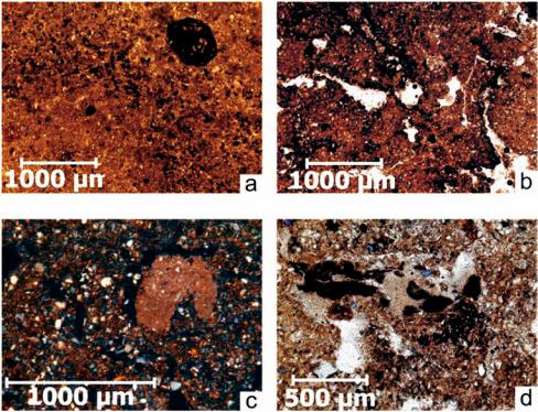 a – железистые пятна в плазме вблизи микрозон аккумуляции точечного аморфного гумуса, гор. А, фото снято без анализатора; b – пленки гумусо-глинисто-железистого состава с примесью марганца, гор. А, фото снято без анализатора; c – плазма сильно инкрустирована тонкозернистым кальцитом, который также формирует пятна и реже – плотные мелкие нодули, гор. Вк, фото снято при скрещенных николях; d – микрозоны плазмы сильно контрастного цвета чередуются, более светлые микрозоны среди бурых и темно-бурых участков, в центральной части фото - глинисто-железистые кутаны имеют диффузные и неровные края со следами явного разрушения, гор. Вg, фото снято без анализатора.
