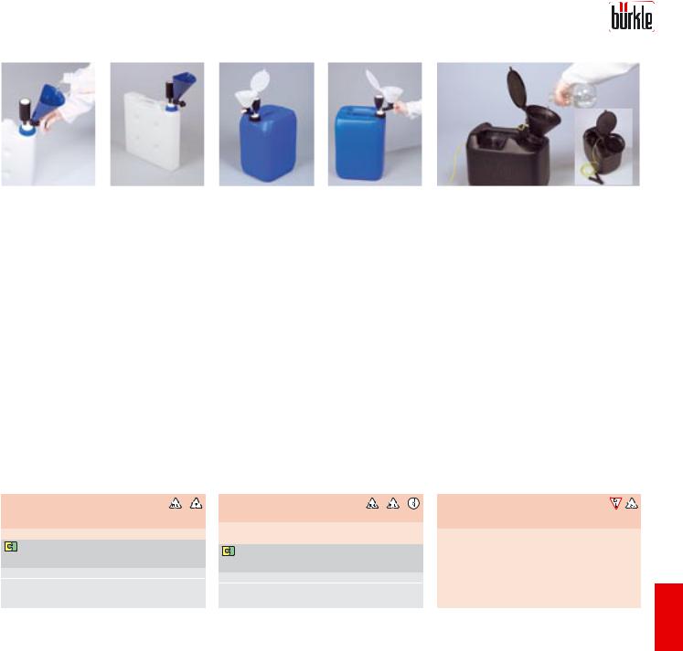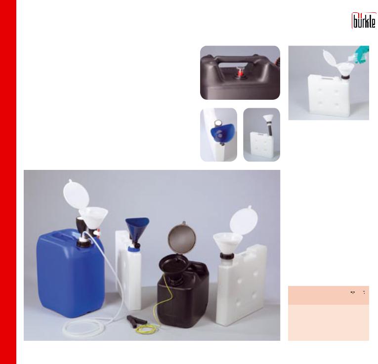 Канистра для утилизации и защитная воронка с запорным краном для сбора больших объёмов жидкостей. Запорный кран открывается одной рукой, что позволяет быстро открывать и закрывать воронку для заполнения, что предотвращает выброс большого количества вредных паров. Воздушный фильтр на основе активированного угля улавливает 99% летучих веществ. Съемный фильтр задерживает суспензии. С помощью соединителя для трубок, который можно приобрести отдельно, жидкость можно по трубке из закрытых систем переливать в ёмкость.