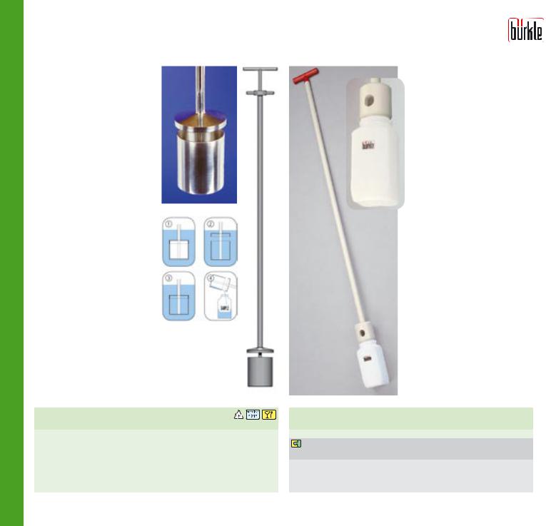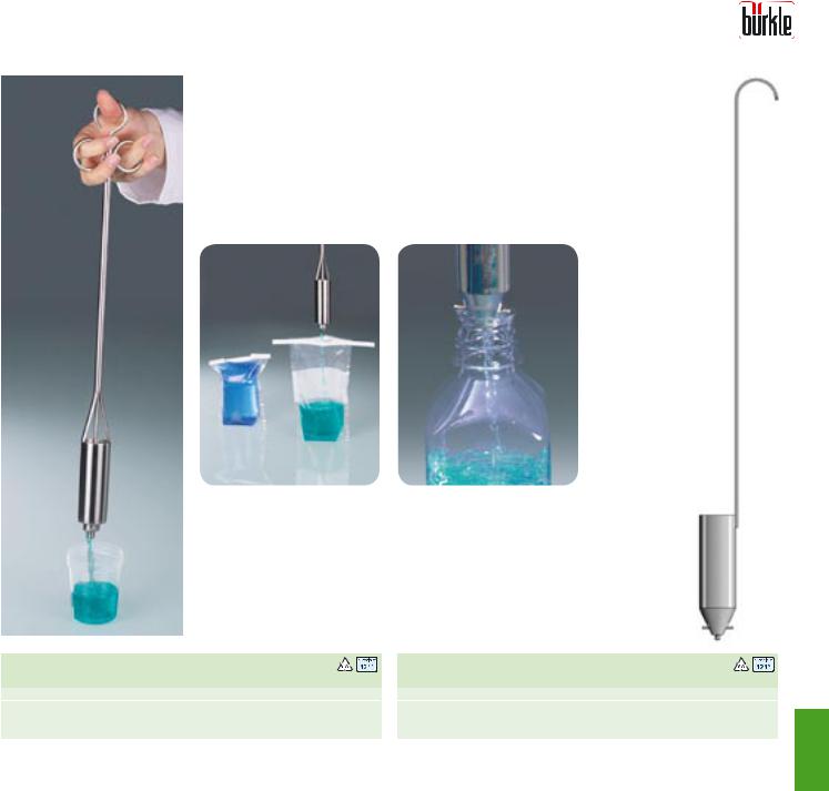 Пробоотборник для жидких и вязких жидкостей. При работе одна рука остается свободной. С выпускной воронкой для безопасного заполнения бутылей для образцов. Нержавеющая сталь V4A (1.4404)