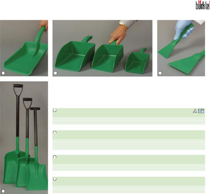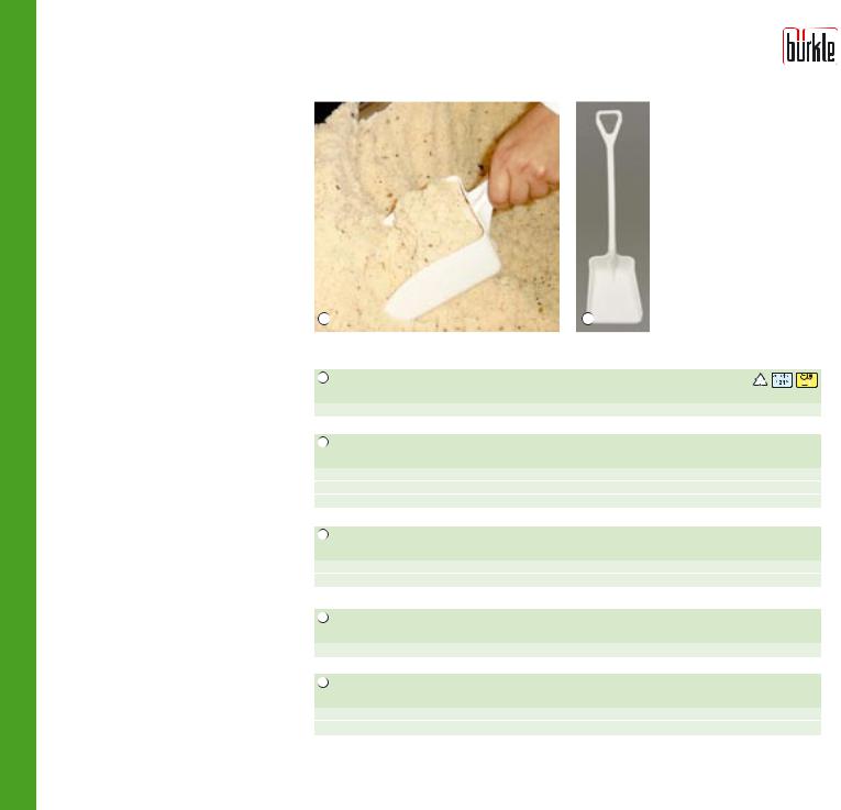 Совки изготовлены из полипропилена и обладают гладкой поверхностью, не имеющей пор, поэтому совки легко очищать. Таким образом, они прекрасно подходят для сферы пищевых продуктов. Совки также можно использовать для работы с материалами, нагретыми до температуры кипения.