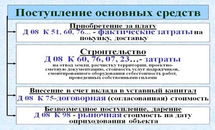 Фактическими затратами на приобретение, сооружение и изготовление основных средств являются: суммы, уплачиваемые организациям по договору строительного подряда и иным договорам; суммы, уплачиваемые организациям за информационные и консультационные услуги, связанные с приобретением объектов основных средств, регистрационные сборы, государственные пошлины и другие аналогичные платежи, осуществленные во время приобретения (получения) прав на объект основных средств, таможенные пошлины, вознаграждения, уплачиваемые посреднической организации, и другие затраты, связанные с приобретением, сооружением, изготовлением, установкой объектов основных средств [1, с. 220]