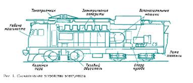 Электровозы состоят из механического, электрического и пневматического оборудования. К механической части относят кузов и тележки, к электрической тяговые двигатели, вспомогательные машины, электрические аппараты и аккумуляторные батареи. К пневматическому оборудованию относят компрессоры, приборы, крапы, клапаны, трубопроводы, резервуары тормозной и воздушной систем.