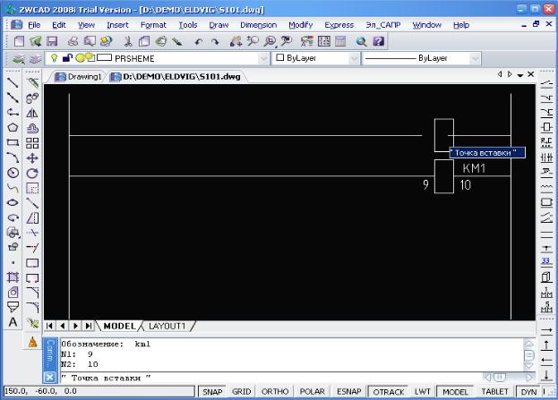 10. Выбрав в меню катушки, выбираем из пиктографического меню катушку нужного вида и указываем её точку вставки на схеме, после чего программа запрашивает позиционное обозначение и номера зажимов.