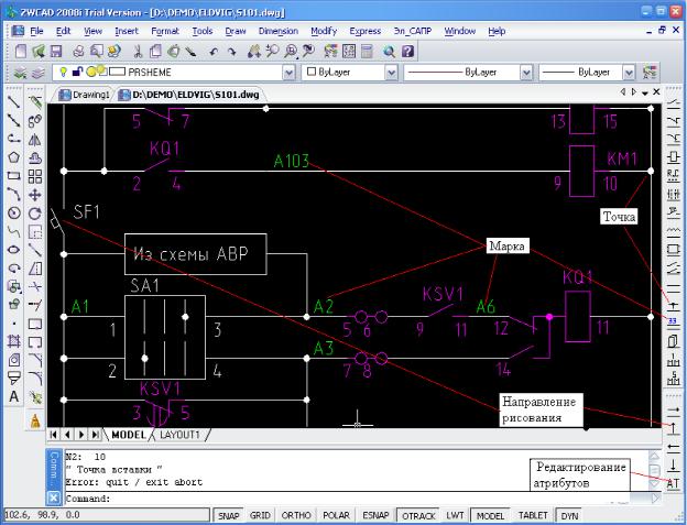 11. Продолжаем рисование схемы с установкой необходимых элементов, марок, точек пересечения. (Обратим внимание, что при прорисовке клемм их номера можно не задавать. Ряд зажимов будет сформирован по маркам, а затем номера клемм перенесутся на схему автоматически).