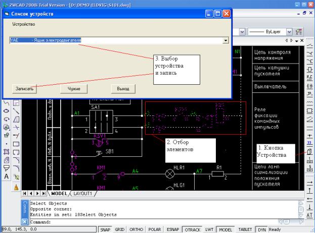 14. Через панель задач WINDOWS переходим в программу САПР ЦВК и начинаем выбирать типы аппаратов. По команде меню Перечень открывается список введенных на схеме аппаратов с распределением по устройствам.