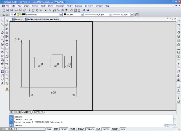 21.Построение общего вида ящика начинается с кнопки Компоновка. В открывшемся окне выбираем кнопку Чертеж, по которой осуществляется автоматический переход к чертежу компоновки. При этом поле чертежа делится на два вида: слева – контур металлоконструкции; справа – контуры аппаратов.