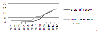 Рисунок 9 - Динамика внешнего государственный долга и его лимита в Республике Беларусь в 2001-2012 гг., млрд. руб.