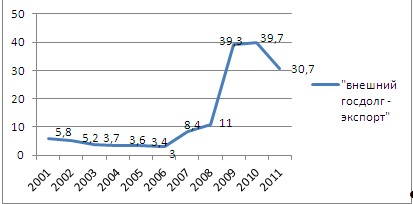 Рисунок 10 - Динамика отношения внешнего государственного долга Республики Беларусь к стоимости экспорта в 2001 - 2011 гг., %