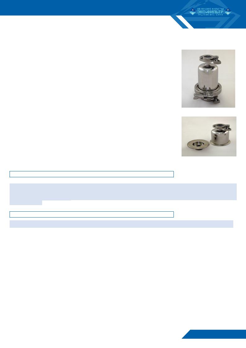 Корпус капсульного фильтродержателя марки ДФП-201L(G)-60 из нержавеющей стали состоит из двух частей, соединяемых с помощью быстросъемного хомута. Подсоединение капсульного фильтродержателя к линии осуществляется с помощью быстросъемного соединения типа Tri-Clamp.