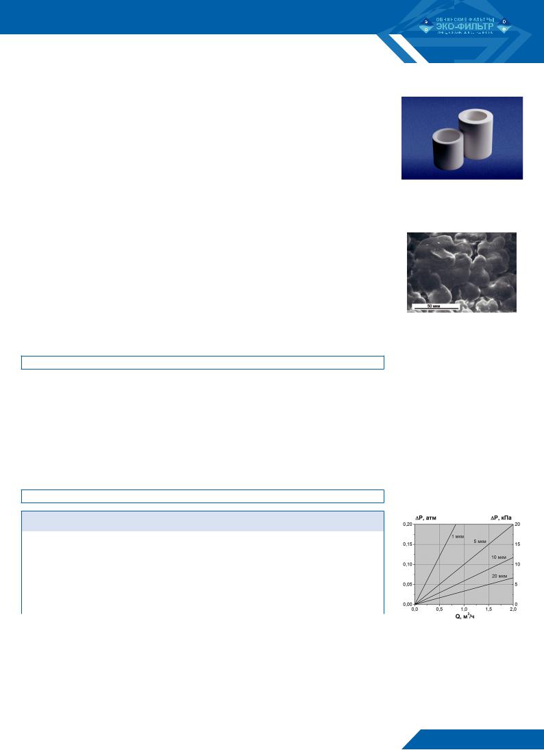 Фильтровальный материал представляет собой двухслойный полый пористый цилиндр высотой 90, 125 или 250 мм, в котором общая пористость и размер пор уменьшаются от наружных слоев к внутренним. Элементы высотой 500, 750 или 1000 мм получают сваркой 2, 3 или 4 элементов высотой 250 мм через переходные детали из полипропилена.