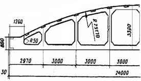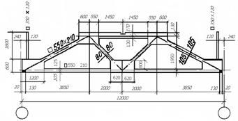 В здании предусмотрены железобетонные безраскосные стропильные фермы длиной 24 м, равной ширине пролета. Они представляют собой составные стержневые конструкции с круговым очертанием верхнего пояса.