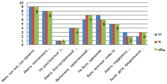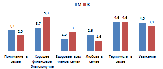 Если же сравнивать ответы парней и девушек, то для парней в семье главное здоровье всех её членов, а у девушек главное в семье любовь. А самая не значительная характеристика идеальной семьи у парней это терпимость в семье, а у девушек финансовое положение(Рис. 4).