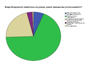 На вопрос «Видя бездомное животное на улице, какие эмоции вы испытываете?» женщины в возрасте 18-25 лет ответили, что им все равно или просто не обращают внимания на животных (3,3%); 35,0% ответили, что им жалко, но что поделаешь; 18,3% стараются не проходить мимо, подкармливают животных; 0,8% опрошенных женщин давно не видят бездомных животных на улицах. У мужчин той же возрастной категории проценты распределились так: 3,3% не обращают внимание; 31,7% мужчин отметили вариант «жалко, но что поделаешь?»; 5,0% стараются мимо не проходить и подкармливают животных; 2,5% ответили, что не видят животных на улицах.
