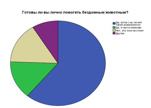 Сопоставляя полученные данные по 2 предыдущим вопросам получаем, что респонденты готовые помогать, но не имеющие возможность отметили, что им все равно или не обращают внимания на бездомных животных (0,6%). Скорее всего, этот респондент был не до конца честен с ответами. Вариант «Жалко, но что поделаешь» выбрали 48,0% респондентов из тех, кто готов помогать, но не имеет такой возможности. 11,7% опрошенных готовых, но не имеющих возможности помогать стараются не проходить мимо. 5,6% респондентов которые выбрали вариант ответа «жалко, но что поделаешь?» отметили, что они часто помогают бездомным животным. 8,4%, которые ответили, что не проходят мимо, так же ответили, что часто помогают (см. таблицу 1).