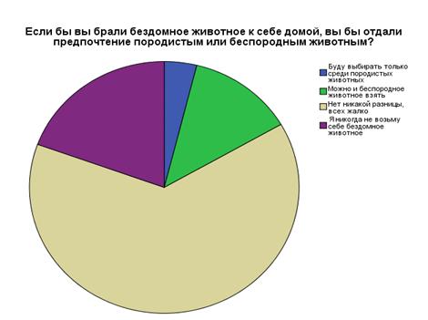 На следующий вопрос «Если бы вы брали бездомное животное к себе домой, вы бы отдали предпочтение породистым или беспородным животным?» были даны следующие ответы: 3,9% будут выбирать только среди породистых животных; 12,8% ответили, что они бы взяли и беспородное животное; для 63,9% нет никакой разницы, всех жалко; 19,4% отвечавших на вопросы анкеты никогда не возьмут себе бездомное животное (см. диаграмму 9).