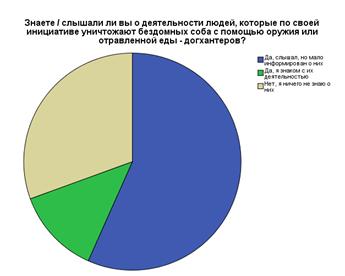 Следующий вопрос был открытым и на него отвечали только те респонденты, которые ответили в предыдущем вопросе, что они одобряют деятельность догхантеров. Самыми популярными ответами на данный вопрос были: «таким образом можно контролировать количество бездомных собак на улице»; «везде ест плюсы и минусы. Есть районы, где эта деятельность необходима»; «потому что в городе стало слишком много бездомных животных»; «одобряю только в том случае, когда эти меры предпринимаются с целью обезопасить людей. Например, стая собак во время течки могут представлять опасность»; «потому что органы местного самоуправления не справляются с ситуацией или же совсем ничего не делают»; «с бездомными животными надо что-то делать. Недопустимо, чтобы они так существовали: угроза людям, разносчики болезней, антисанитария»; «обезопасить жизнь людей»; «хочу спокойно ходить по улицам, не бояться, что меня укусит бродячая собака»; «при быстрой смерти животное ничего не испытывает. В остальное время оно подвержено жестокости, голоду. И вынуждено постоянно находиться в поиске. Так же нет опасности того, что в периоды, когда животные «гуляют» прохожий будет подвержен нападению»; «это хоть какое-то подобие порядка и равновесия»; «чтобы было меньше опасности для детей».