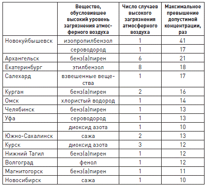 На территории Пермского края имеются 4 города с таким уровнем загрязнения, в Оренбургской, Ростовской, Самарской и Свердловской областях (и Екатеринбург) - 5 городов, в Красноярском крае и Ханты-Мансийском АО (Югра) - 6 городов, в Иркутской области - 7 городов.
