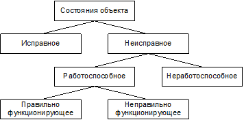 Для неисправного объекта возможны два состояния: работоспособное и неработоспособное. Работоспособный объект – объект, у которого техническим требованиям соответствуют лишь свойства, характеризующие способность выполнения заданных функций. Переход исправного объекта в работоспособное состояние называется повреждением. Переход работоспособного объекта в неработоспособное состояние называется отказом.