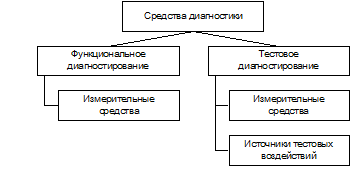 При диагностике состояния объекта используются диагностические технические средства, состав которых представлен на рисунке 2.2. Основу комплекса технических средств составляют контрольно-измерительные средства, с помощью которых получают информацию о диагностических параметрах объекта. Диагностирование может быть функциональным (на объект поступают только рабочие воздействия) и тестовым (при подаче специальных воздействий).