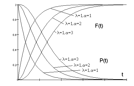 Графики для функций распределения F(t) и вероятности безотказной работы P(t) приведены на рисунке 4.8. Характер зависимостей изменяется в широких пределах при изменении параметров распределения.