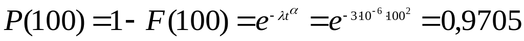 Пример 1. Определить вероятность безотказной работы прибора в течение 100 часов, если его наработка на отказ описывается распределением Вейбулла с параметрами α = 2 и λ = 310-6 ч-1 .