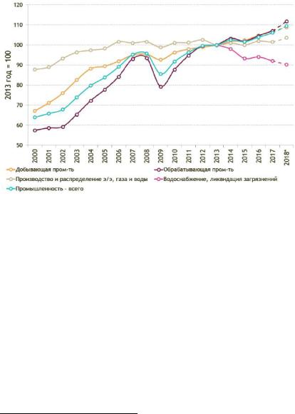 Рис. 4. Индекс промышленного производства в России, 2000–20181 годы, 2013 год = 1002