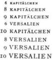 Наличие настоящих капительных шрифтов кег лей 6, 8, 9 и 10 дает типографии существенные дополнительные преимущества. Капитель шестого кегля вполне может использоваться в качестве «больших букв» в миниатюрных изданиях, а вме сто четырех размеров заглавных букв при нали чии капителей при том же наборе кеглей мы располагаем восемью различными видами заглав-