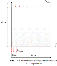 20см, радиус области стекания жидкости - 2см. На верхней границе втекает