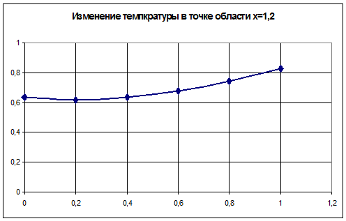 График изменения температуры в точке области x=1,2 и при значении времени t=0,6