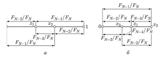 Первые вычисления проводятся в точках х1=FN-2/FN, x2= FN-1/FN, которые расположены симметрично относительно середины отрезка[0,1].