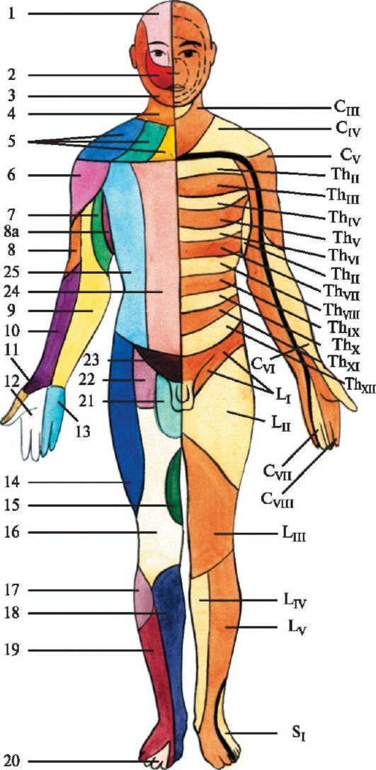I - глазной нерв (I ветвь тройничного нерва); 2 - верхнечелюстной нерв (II ветвь тройничного нерва); 3 - ниж- нечелюстной нерв (III ветвь тройничного нерва); 4 - поперечный нерв шеи; 5 - надключичные нервы (латеральные, промежуточные, медиальные); 6 - подмышечный нерв; 7 - медиальный кожный нерв плеча; 8 - задний кожный нерв плеча; 8а - межреберноплечевой нерв; 9 - медиальный кожный нерв предплечья; 10 - латеральный кожный нерв предплечья; II - лучевой нерв; 12 - срединный нерв; 13 - локтевой нерв; 14 - латеральный кожный нерв бедра; 15 - передняя ветвь запирательного нерва; 16 - передние кожные ветви бедренного нерва; 17 - общий малоберцовый нерв; 18 - подкожный нерв (ветвь бедренного нерва); 19 - поверхностный малоберцовый нерв; 20 - глубокий малоберцовый нерв; 21 - бедренно-половой нерв; 22 - подвздошно-паховый нерв; 23 - передняя кожная ветвь подвздошно-подчревного нерва; 24 - передние кожные ветви межреберных нервов; 25 - латеральные кожные ветви межреберных нервов