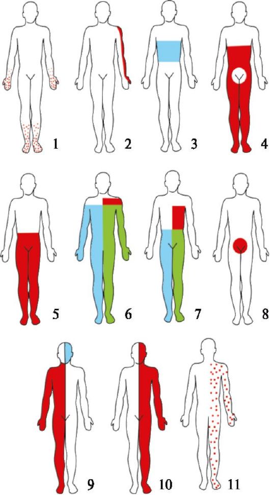 Красным цветом обозначено нарушение всех видов чувствительности, голубым - поверхностной чувствительности, зеленым - глубокой чувствительности