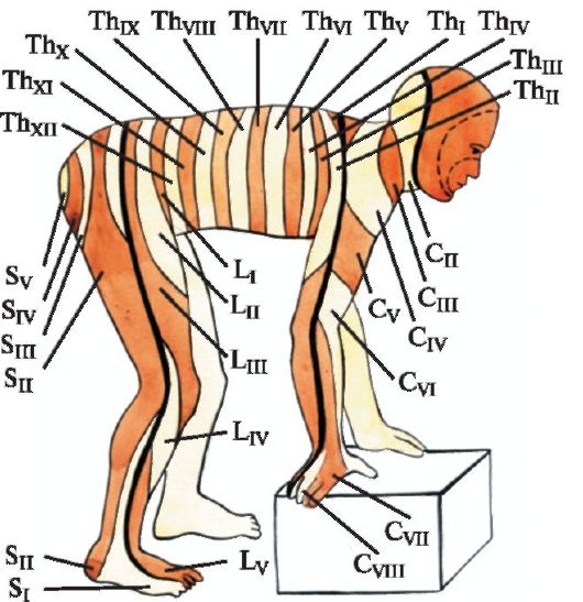 Уровень сегментарной иннервации можно определить, пользуясь следующими ориентирами: уровень подмышечной впадины - второй грудной сегмент - Th2, уровень сосков - Th5, уровень пупка - Th10, уровень паховой складки - Th12. Нижние конечности иннервируются поясничными и верхними крестцовыми сегментами.