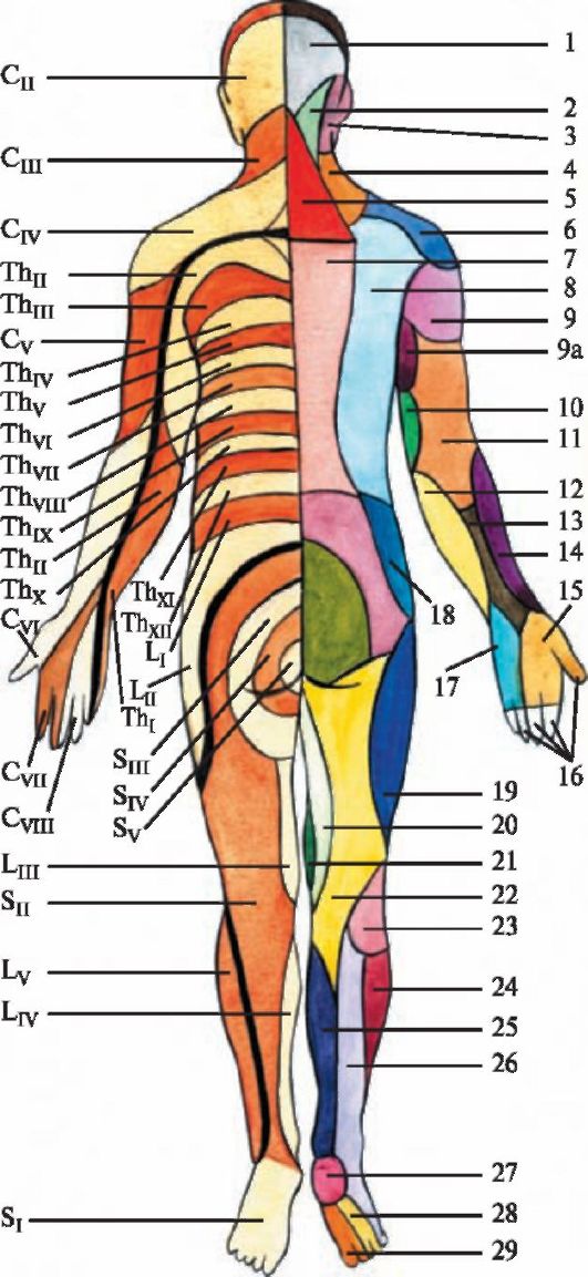 Рис. 2.6 б. Иннервация кожной чувствительности периферическими нервами (справа) и сегментами спинного мозга (слева) [схема]. Задняя поверхность: 1 - большой затылочный нерв; 2 - малый затылочный нерв; 3 - большой ушной нерв; 4 - поперечный нерв шеи; 5 - подзатылочный нерв; 6 - латеральные надключичные нервы; 7 - медиальные кожные ветви (от задних ветвей грудных нервов); 8 - латеральные кожные ветви (от задних ветвей грудных нервов); 9 - подмышечный нерв; 9а - межреберно-плечевой нерв; 10 - медиальный кожный нерв плеча; 11 - задний кожный нерв плеча; 12 - медиальный кожный нерв предплечья; 13 - задний кожный нерв предплечья; 14 - латеральный кожный нерв предплечья; 15 - лучевой нерв; 16 - срединный нерв; 17 - локтевой нерв; 18 - латеральная кожная ветвь подвздошно-подчревного нерва; 19 - латеральный кожный нерв бедра;20 - передние кожные ветви бедренного нерва; 21 - запирательный нерв; 22 - задний кожный нерв бедра; 23 - общий малоберцовый нерв; 24 - поверхностный малоберцовый нерв; 25 - подкожный нерв; 26 - икроножный нерв; 27 - латеральный подошвенный нерв; 28 - медиальный подошвенный нерв; 29 - большеберцовый нерв